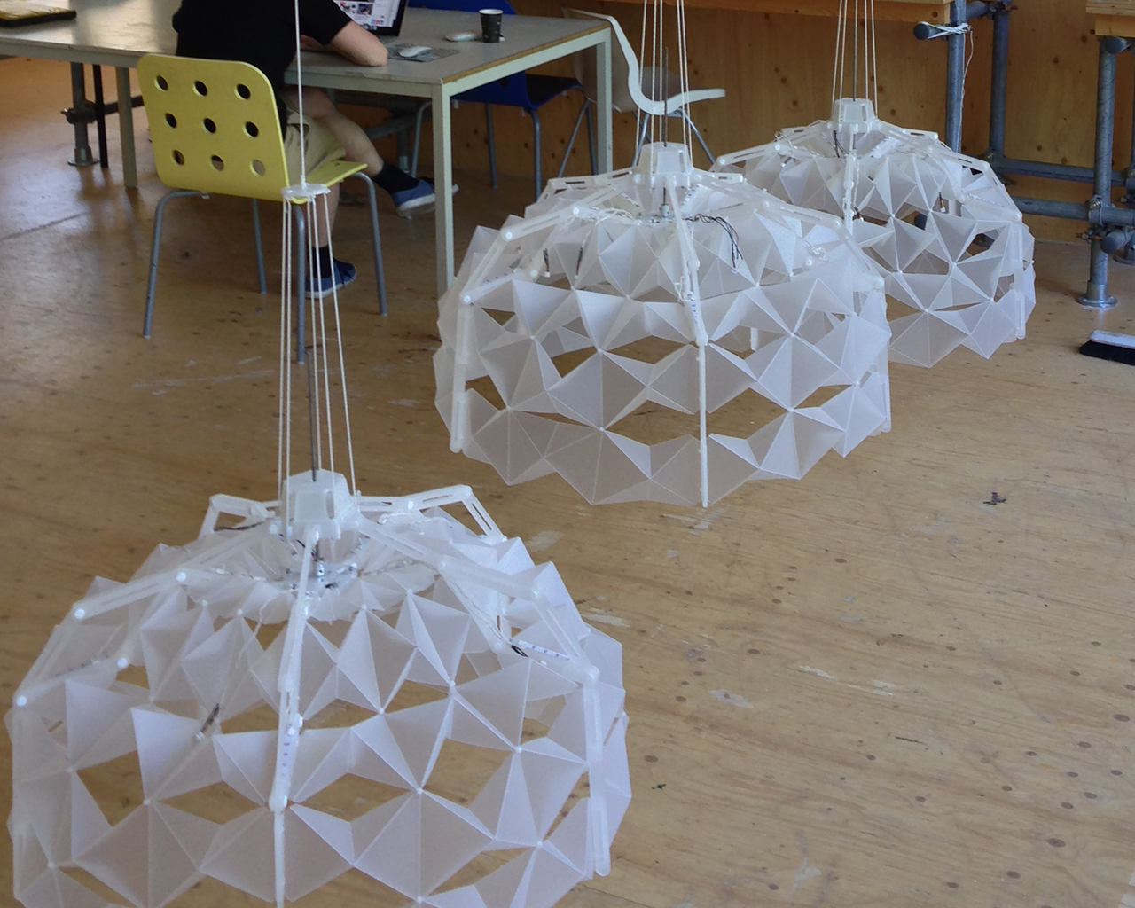Three full size and fully functional prototypes were built using laser cut and 3D-printed parts. The lamps consist of a bi-directional winch with a braking mechanism and a large semi-spherical lamp that opens and closes like a flower using an intricate hoberman-sphere mechanism. LED lighting illuminates the objects throughout.